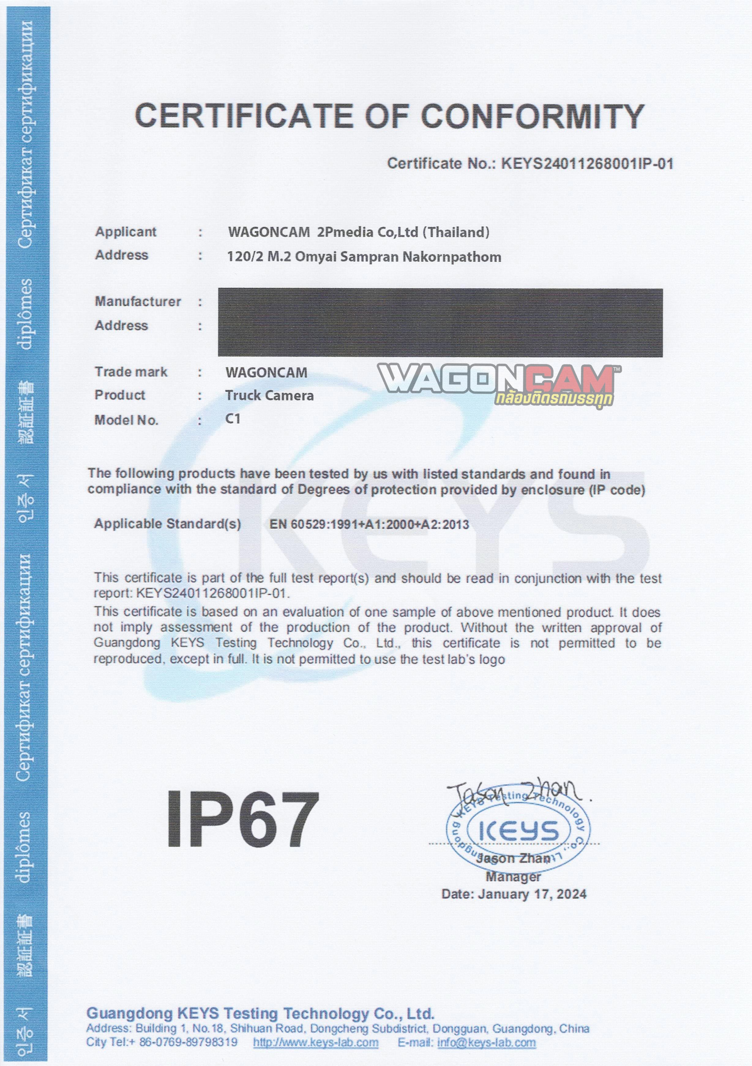 ทดสอบโดย ใช้หัวฉีด (Nozzle) ขนาด 12.5 mm ฉีดรอบตัวอุปกรณ์ด้วยแรงดัน 100 kPa ที่ระยะห่าง 3 m
