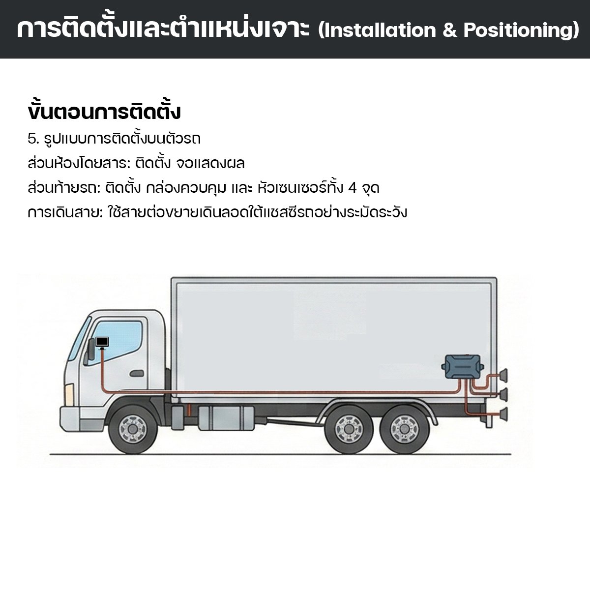 Heavy Duty Design: ตัวกล่องควบคุม (Control Box) และหัวเซนเซอร์ถูกออกแบบให้ทนต่อแรงสั่นสะเทือนและความร้อนสูง เหมาะกับการใช้งานหนักบนรถบรรทุกและรถบัส