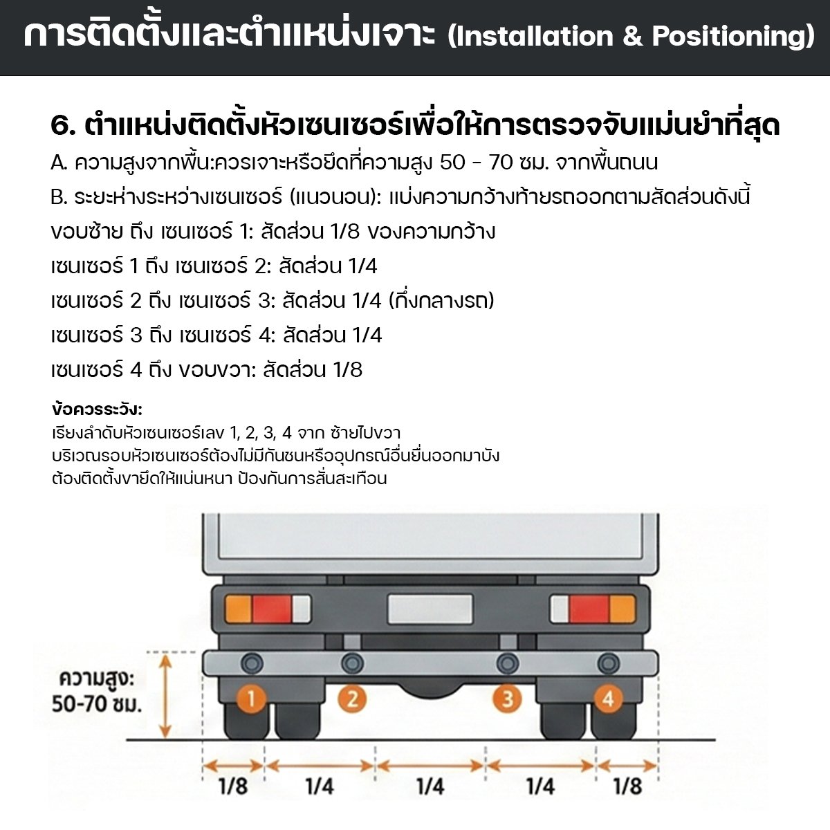 ขนาดหัวเซนเซอร์: ออกแบบมาเพื่อติดตั้งกับกันชนเหล็กหรือท้ายรถบรรทุกโดยเฉพาะ